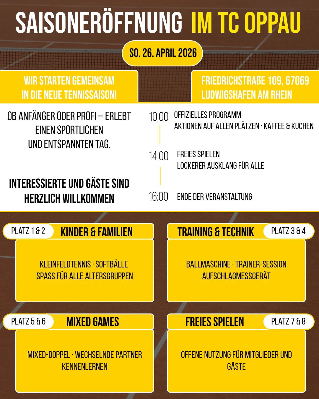 Am westlichen Ortsrand von Oppau, in der Friedrichstraße 109, direkt am Feld gelegen, befindet sich unsere Anlage. 8 Freiplätze und eine 2-Feld-Halle warten darauf, von Ihnen bespielt zu werden. Auf dem mediterran ausgerichteten Gelände befindet sich auch eine Kinderspielwiese für unsere Jüngsten.